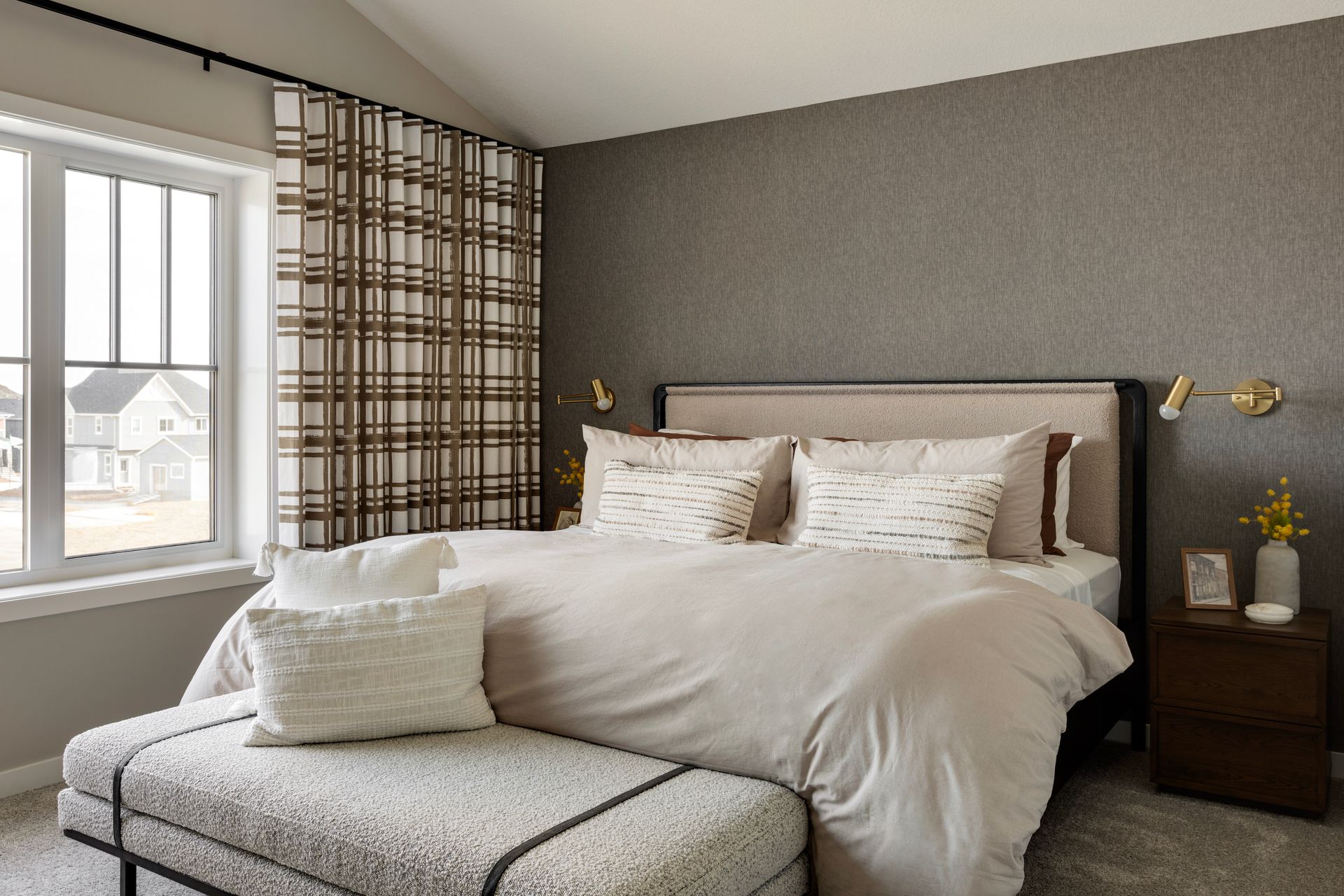 • A bedroom with a large bed and a bench